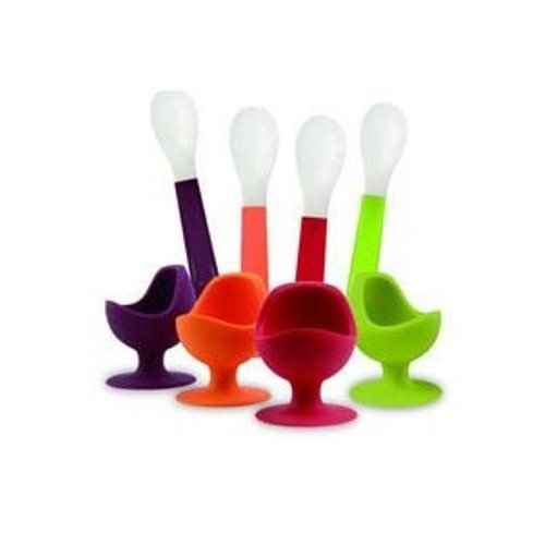 - Descrizione dettagliata: 4 portauovo di design in silicone con 4 cucchiai. I portauovo sono dotati di sistema di ventose per aderire saldamente alla tavola.